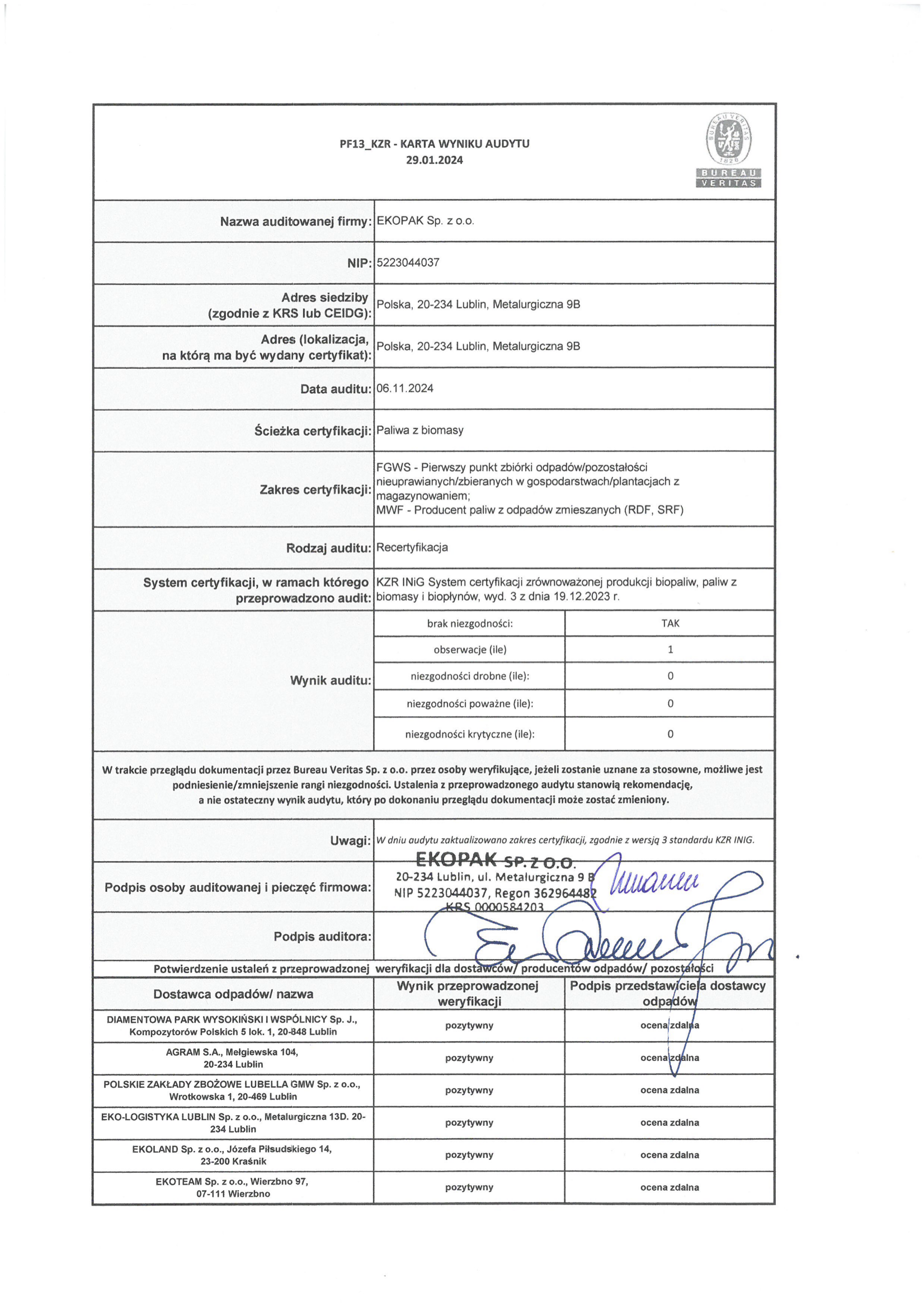 z przyjemnością informujemy, iż po audycie recertyfikującym systemu KZR INiG otrzymaliśmy ponowną rekomendację do wydania certyfikatu zgodności z normą.