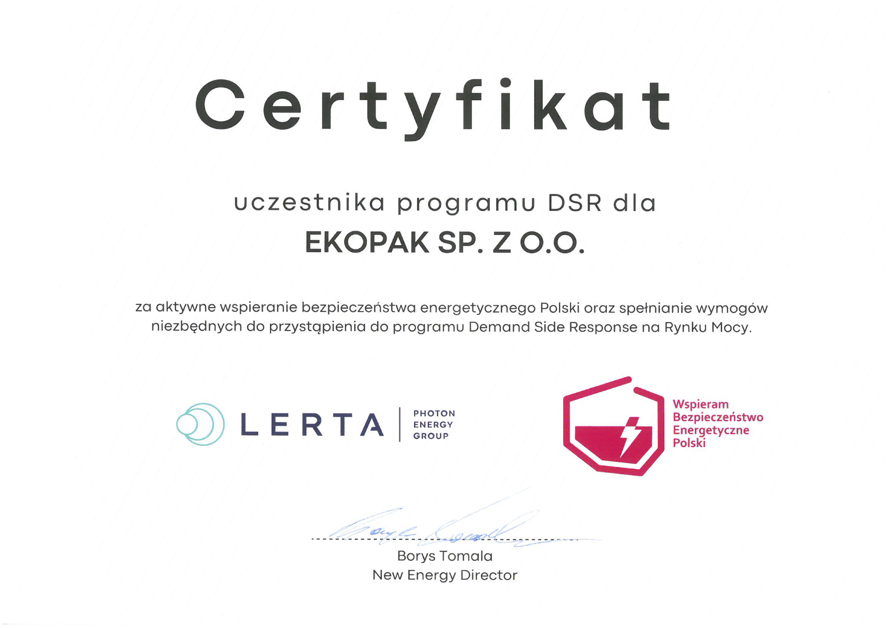Firma EKOPAK została uhonorowana Certyfikatem uczestnictwa w programie DSR za jej aktywny udział w wspieraniu bezpieczeństwa energetycznego Polski.